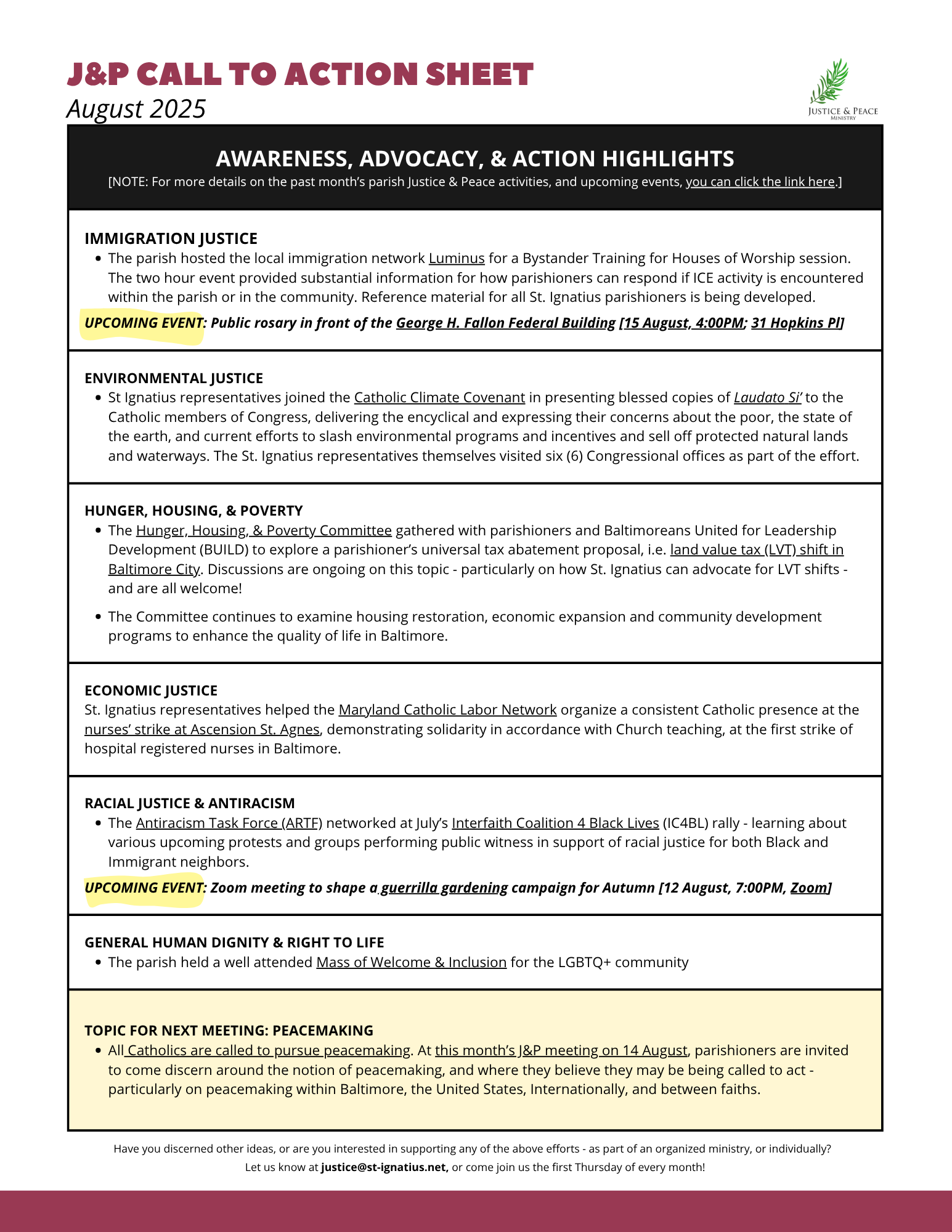We are dedicated to work to bring the Church’s social teaching on worker justice and the economy to fruition. Working as an arm of the Justice & Peace Ministry of our St. Ignatius Catholic Community, we are called and challenged to articulate, advocate and act upon critical economic issues that affect our neighbors, families, and communities across our city, and our world. We are also called to be a resource to provide parishioners with opportunities to live out their faith through working for economic justice. As such we: