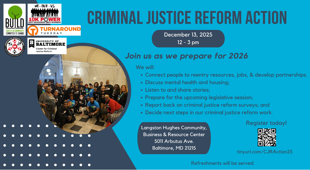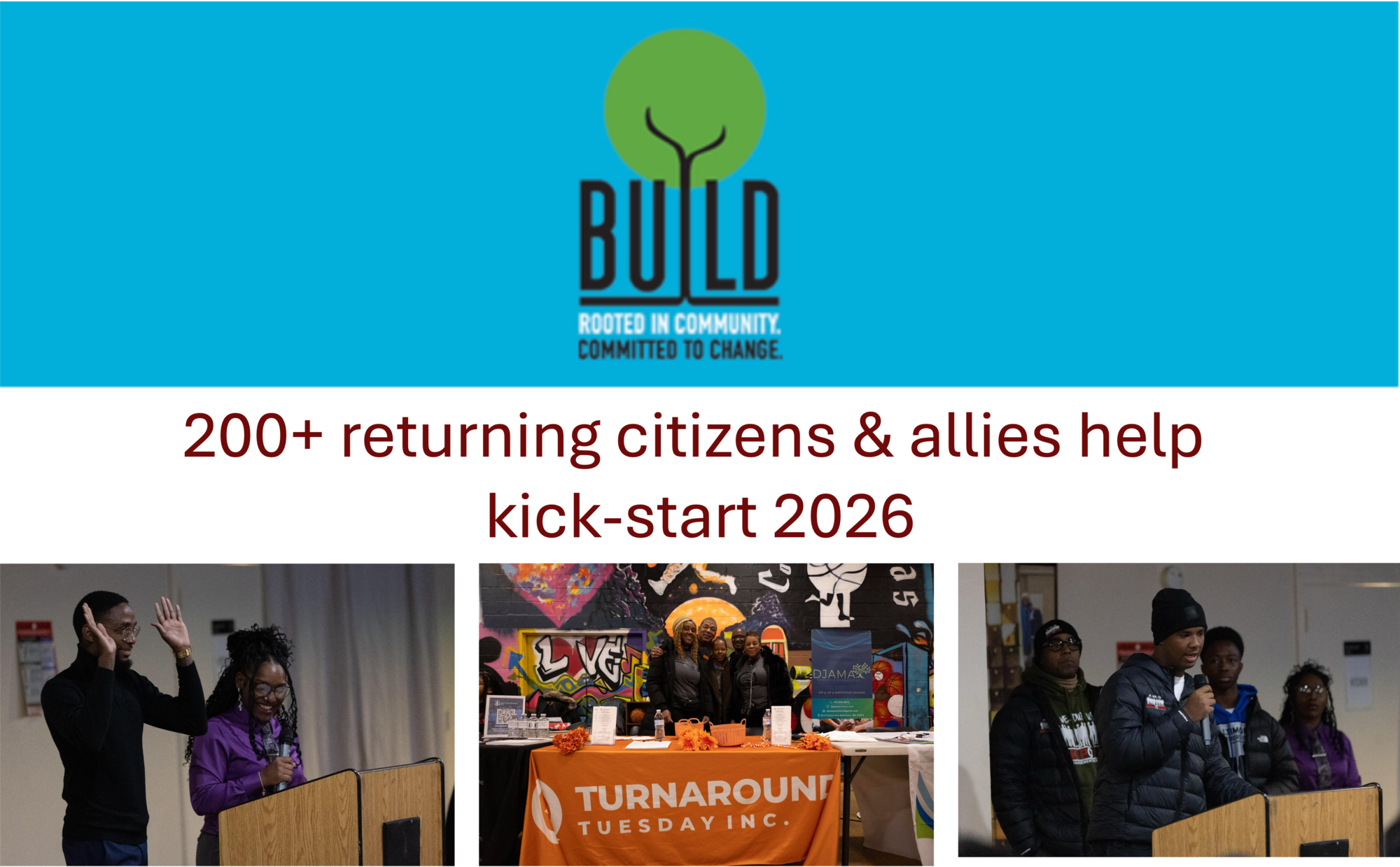 On Saturday, BUILD joined with Turnaround Tuesday, We Our Us, Out for Justice, the University of Baltimore's Center for Criminal Justice Reform, and national partners like the NAACP Legal Defense Fund and Vera Institute for Justice at the Langston Hughes Community, Business, & Resource Center in Park Heights for a powerful gathering of returning citizens and allies. More than 200 people came together to reflect on the momentum we created in our criminal justice work in 2025, share personal stories of impact, and recommit to the work ahead. The convening was both a celebration and a call to action—energizing leaders to deepen their organizing and push for even greater victories in 2026.